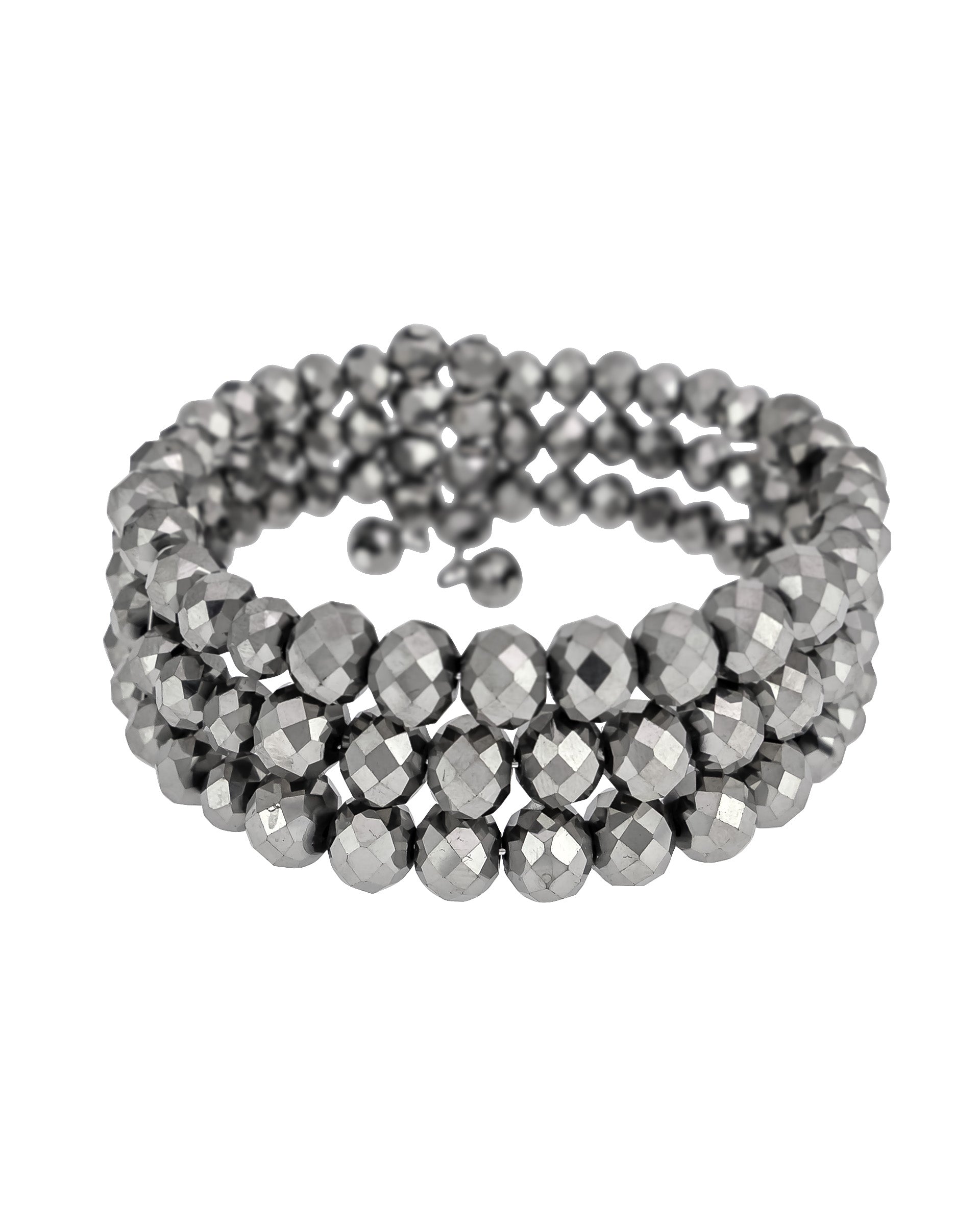- Triple-row beaded coil bracelet with faceted hematite-tone beads