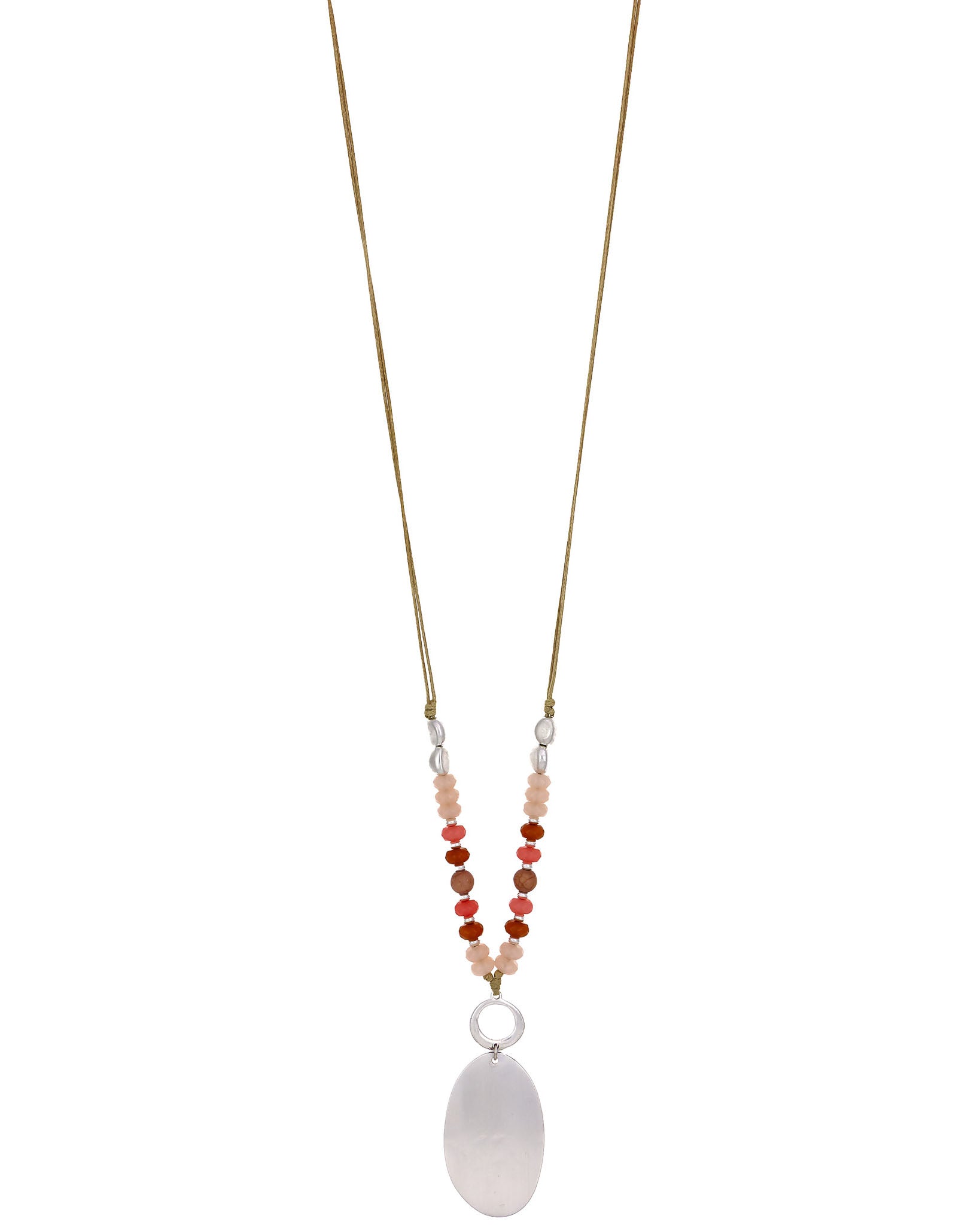 Designed with delicate beaded accents and an elongated silhouette, this necklace brings gentle movement and refined color to layered styling.