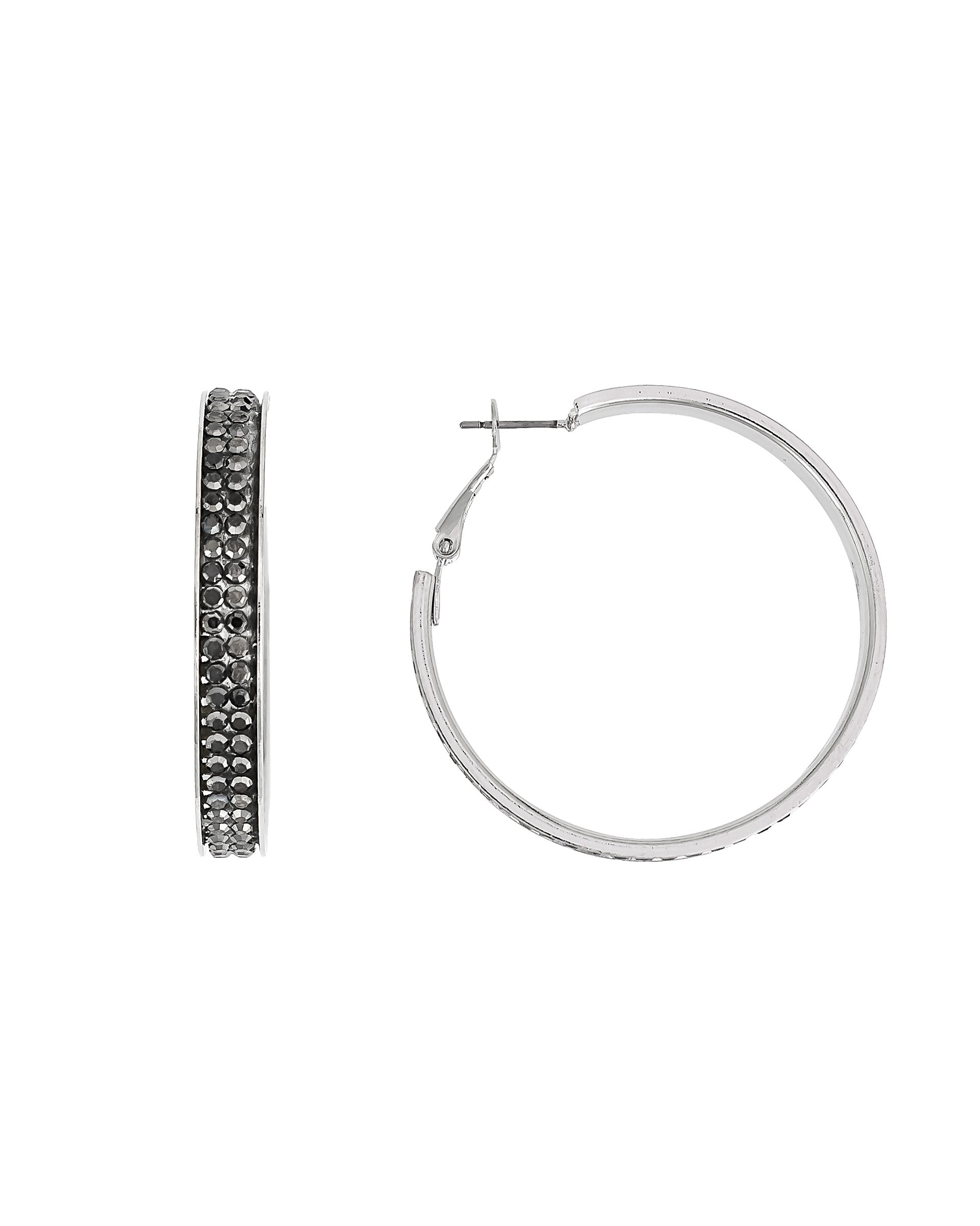 Introducing the Dauplaise Jewelry Lunar Pavé Hoop Earrings, a modern wardrobe essential with just the right amount of edge. These sleek hoops are finished in a cool hematite tone and detailed with a front row of faceted glass stones that catch the light with every turn. Lightweight yet statement-making, they’re perfect for dressing up a simple tee and jeans or adding shimmer to your favorite little black dress.