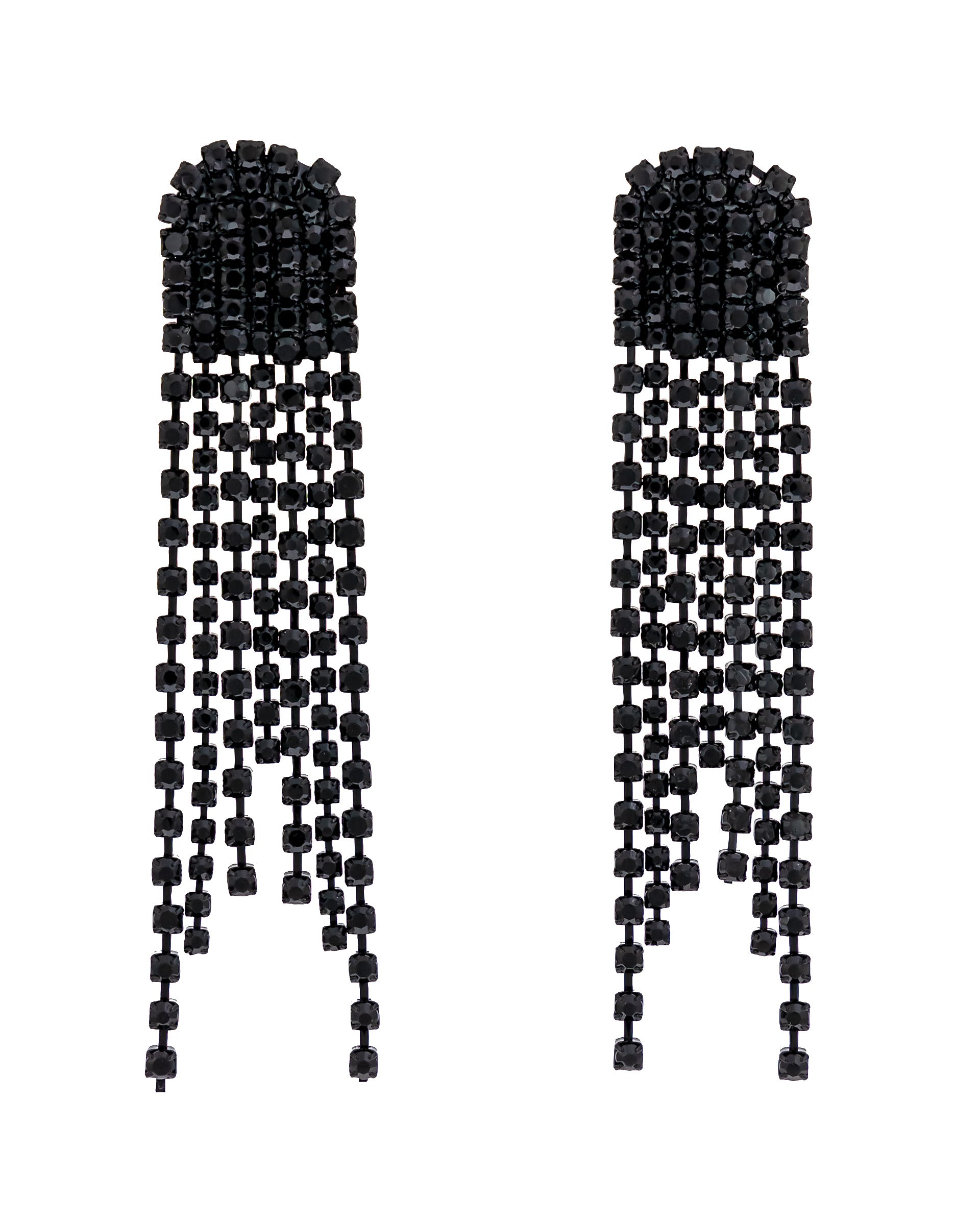 - Jet-black crystal fringe chandelier earrings